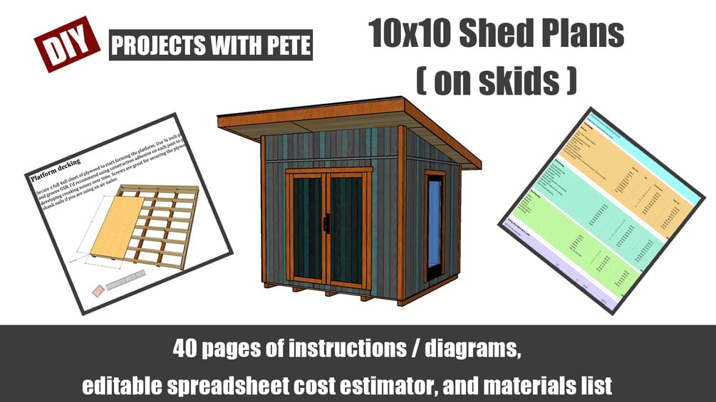 Thank you for your interest in the DIY Pete 10x10 shed on skids plans. These detailed plans will walk you through the process of building your own backyard shed. With over 40 pages of detailed information, you will have the guidance to complete this project.