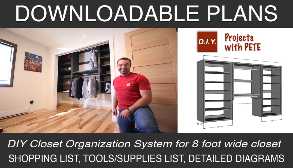 Looking to get organized and have a great functioning storage solution for your closet? If so, check out these plans for the shopping list, cut list, measurements, and detailed diagrams. The plans are meant for an 8 foot wide closet, but they can easily be modified to fit your closet's width. The total depth of the shelving is 16 1/2 inches once the trim is added. Thanks so much for downloading the plans and have fun with the project! - DIY PETE