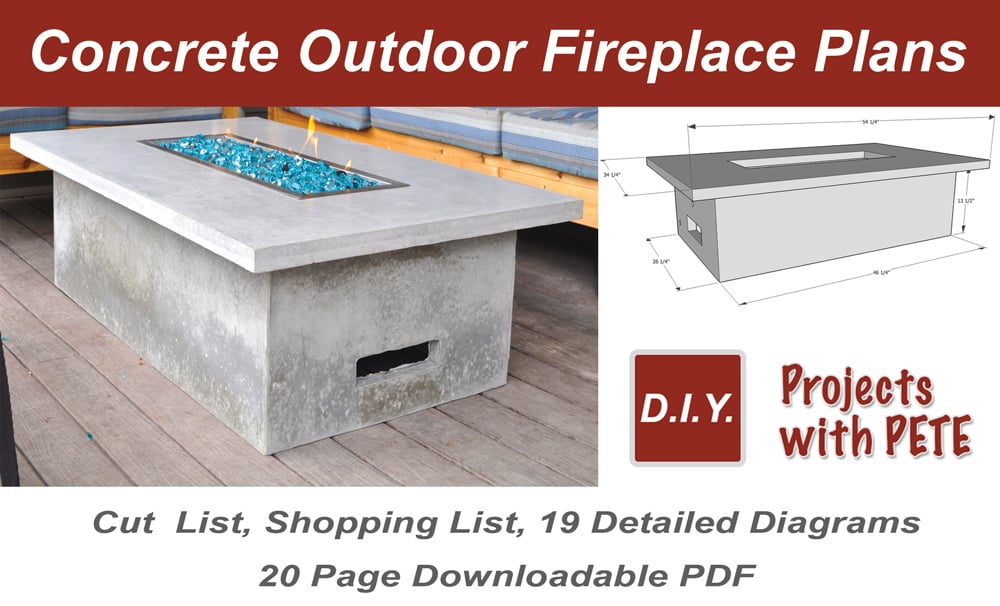 20 Page Downloadable PDF with all the measurements needed to replicate this outdoor gas fireplace which will be the talking point of your patio area. The plans include a cut list, shopping list, 19 detailed diagrams, and instructions to build the mold and concrete base/tabletop for your gas fireplace.